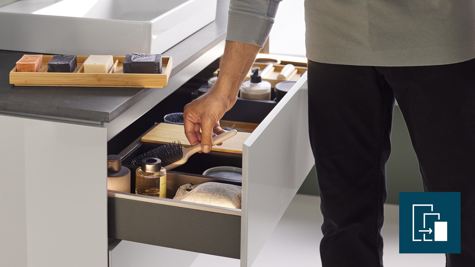 A belső értékek is számítanak! A fiókban elhelyezett tárolódobozokban és rendszerezőkben átlátható módon tárolhatók a fürdőszobai eszközök. A Geberit ONE, Geberit Acanto és Geberit iCon fürdőszobai termékcsaládokhoz bambusz- és lávaszínű rekeszekből álló moduláris tárolórendszer kapható. A moduláris szettek pontosan illeszkednek bármilyen fiókszélességhez, és opcionálisan kaphatók.